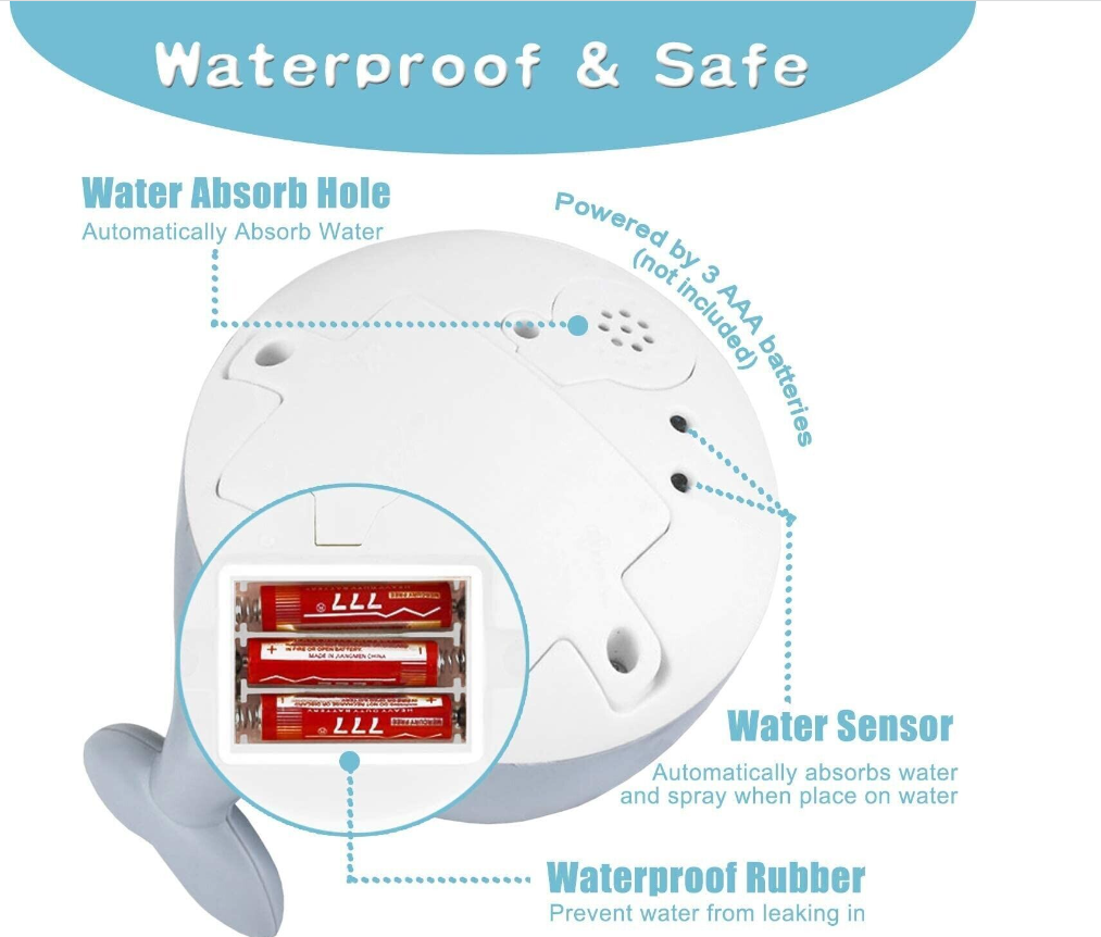 Safe & Durable Material--Our bath toys for baby are made of high quality ABS material components, super durable, Round edges of the toddler toys to protect kids' skin during exploring the new world and stimulate the cognition of the new world.Best water spray bath toy ever! Mold free bath toys.Battery case is equipped with sealing silicone to prevent electricity leakage.